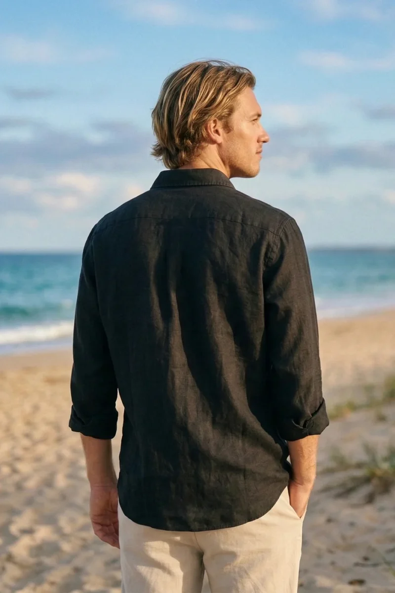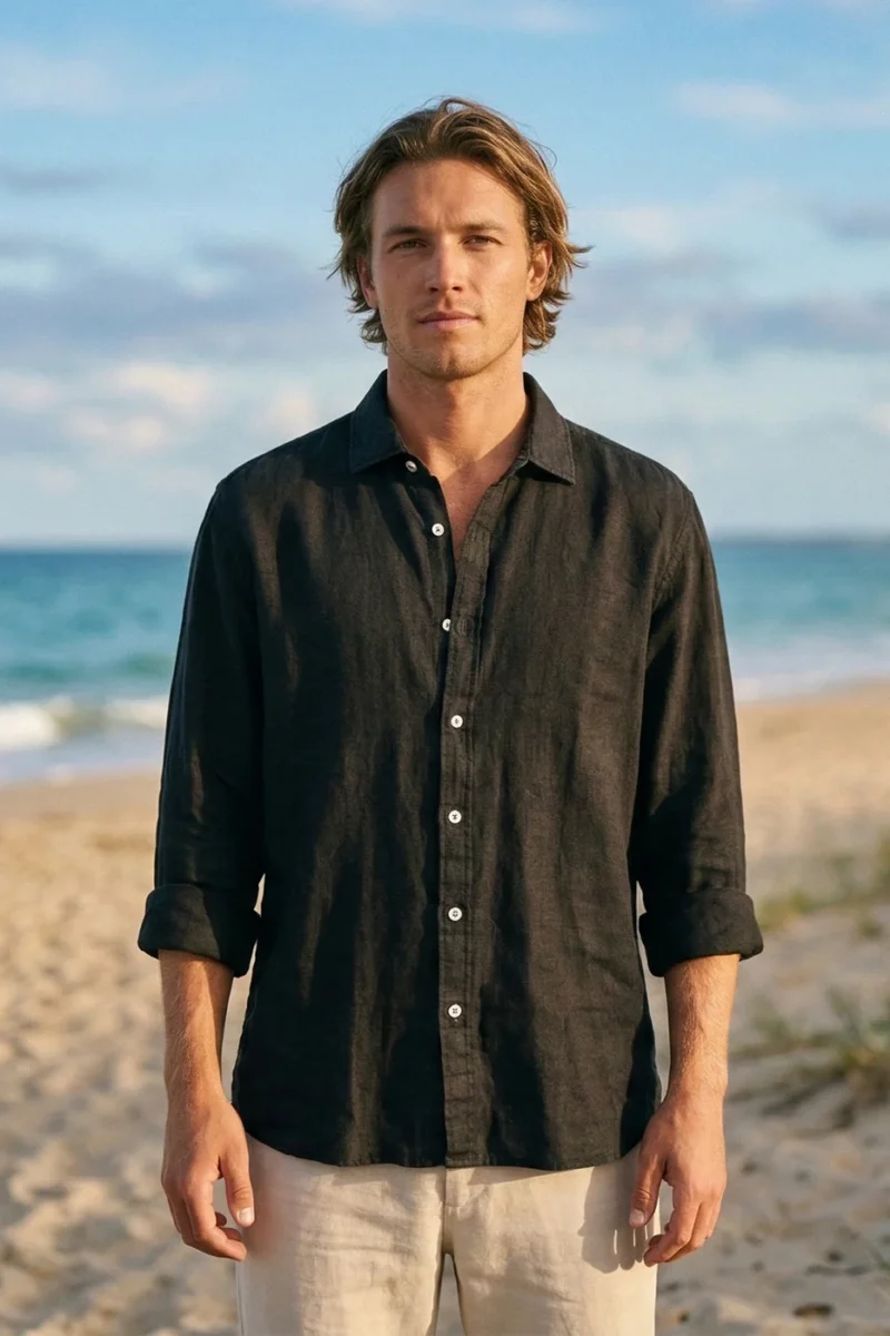 Esta camisa de lino para hombre en negro destaca por su moda sostenible y encanto sencillo. El color natural del lino sin teñir realza su carácter orgánico, mientras el tejido 100% lino ofrece transpirabilidad y comodidad insuperables. Es una prenda elegante y atemporal que combina con todo, perfecta para lograr un estilo relajado con elegancia mediterránea, sin renunciar a la ropa fresca y cómoda en cualquier ocasión.