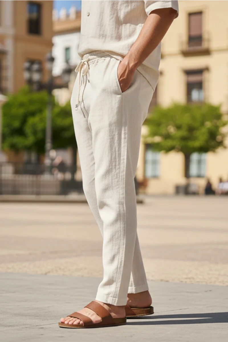 Confeccionado con tejidos naturales de alta calidad, el lino aporta una sensación fresca, transpirable y ligera, perfecta para primavera y verano. Su corte cómodo y su cintura ajustable ofrecen libertad de movimiento y un ajuste favorecedor, pensado para acompañarte durante todo el día.