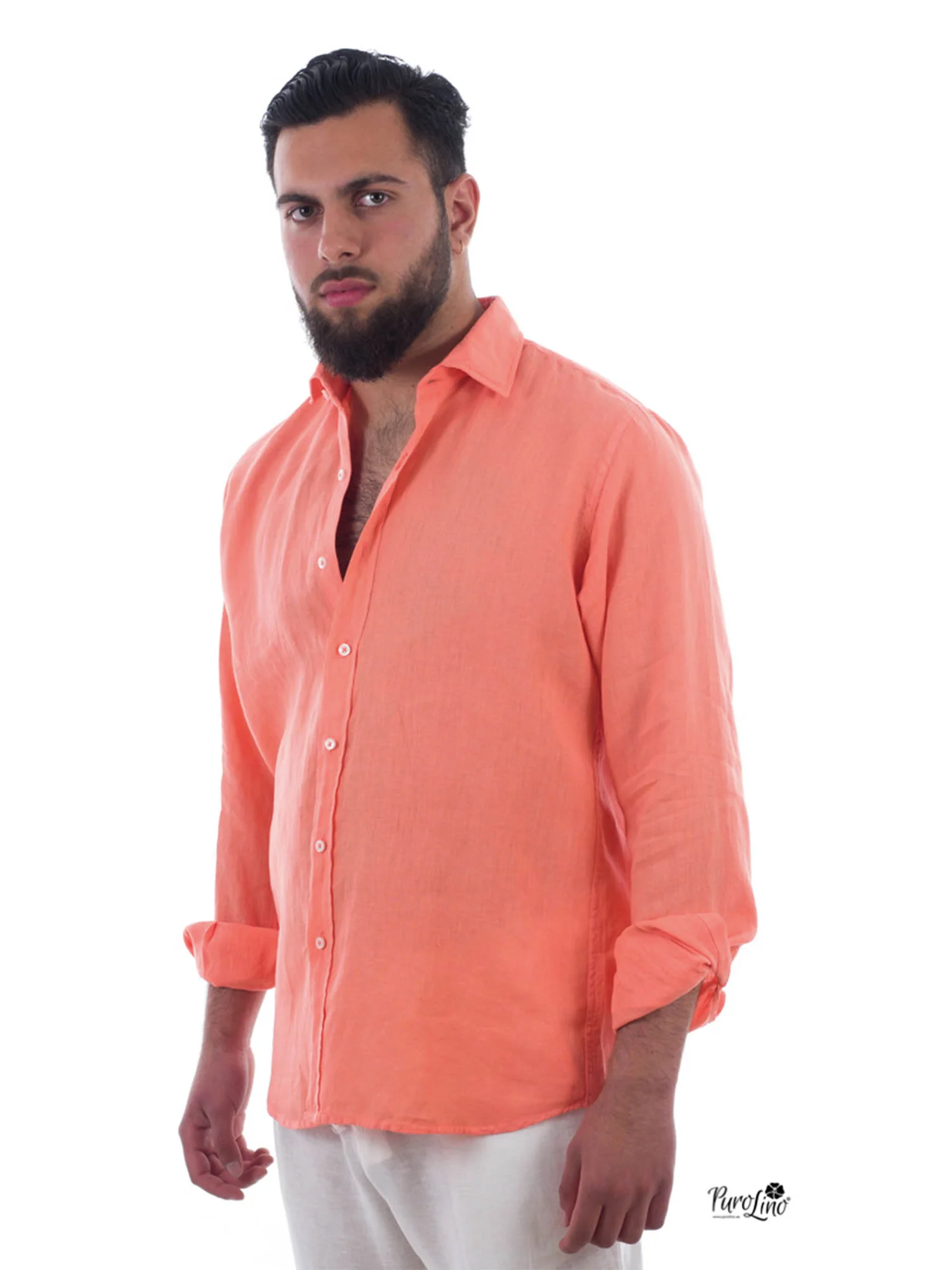 Realza tu estilo con el impacto y la originalidad del color coral, y descubre la elegancia atemporal con nuestra camisa de lino papaya.