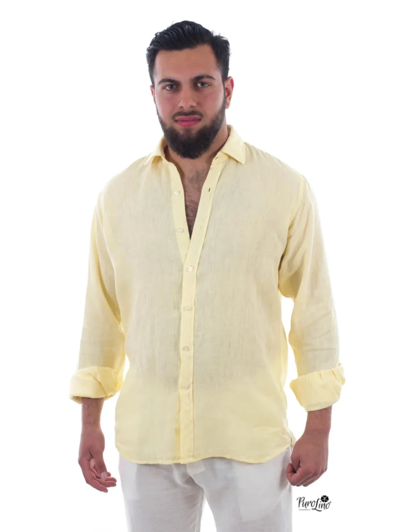 Realza tu estilo con la energía y versatilidad del amarillo, y experimenta la elegancia con nuestra camisa de lino vainilla.